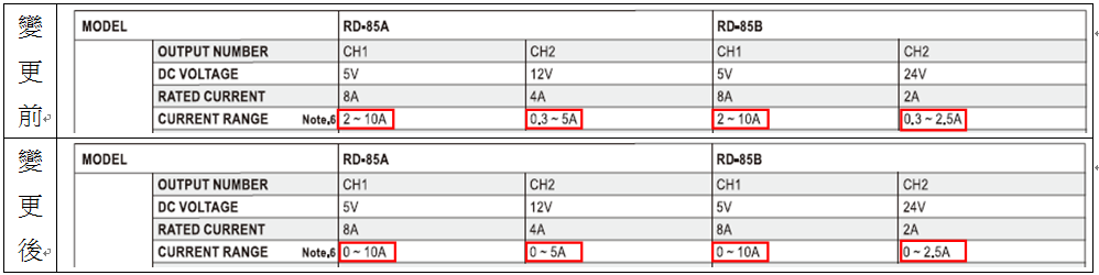 自2019年06月04日生產(chǎn) (工令: Y1906D)之標準品(詳細請參見下方表格)即導入升級后新版本。本次變更所增加之成本保持由明緯自行吸收,售價將不會調(diào)整,若您對本次產(chǎn)品變更有任何疑問,請參閱明緯官網(wǎng)較新公告的規(guī)格書,或請您與明緯業(yè)務代表聯(lián)系。
