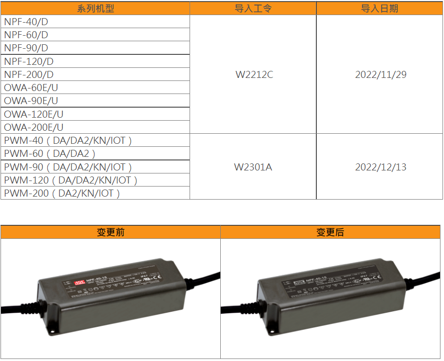為響應(yīng)更環(huán)保的生產(chǎn)制造方式,及提高自動(dòng)化生產(chǎn)率,明緯將相關(guān)LED電源塑料殼類機(jī)型,由傳統(tǒng)貼卷標(biāo)標(biāo)示,改成雷射雕刻方式,以減少塑料化合物的使用,并降低人工操作的誤差,持續(xù)改善生產(chǎn)流程與降低對(duì)環(huán)境的沖擊,為我們的環(huán)境盡一份心力。此次,相關(guān)導(dǎo)入雷射雕刻卷標(biāo)系列機(jī)型如下表說(shuō)明,若您對(duì)此變更有任何應(yīng)用上的問題,請(qǐng)立即與明緯的業(yè)務(wù)代表聯(lián)系。